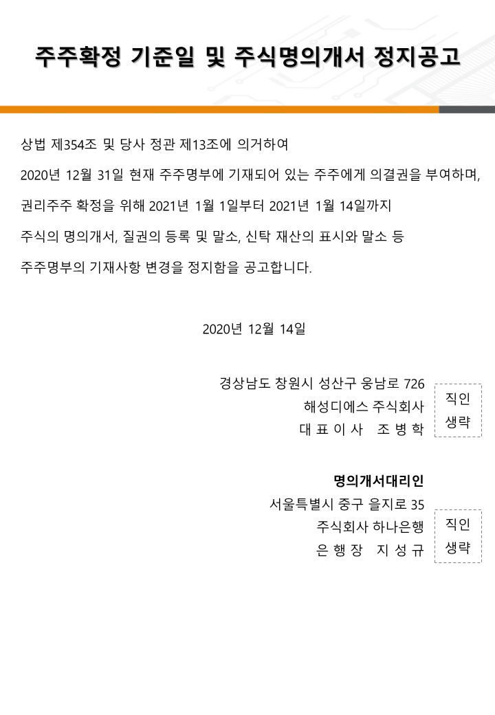 주주확정 기준일 및 주식명의개서 정지공고